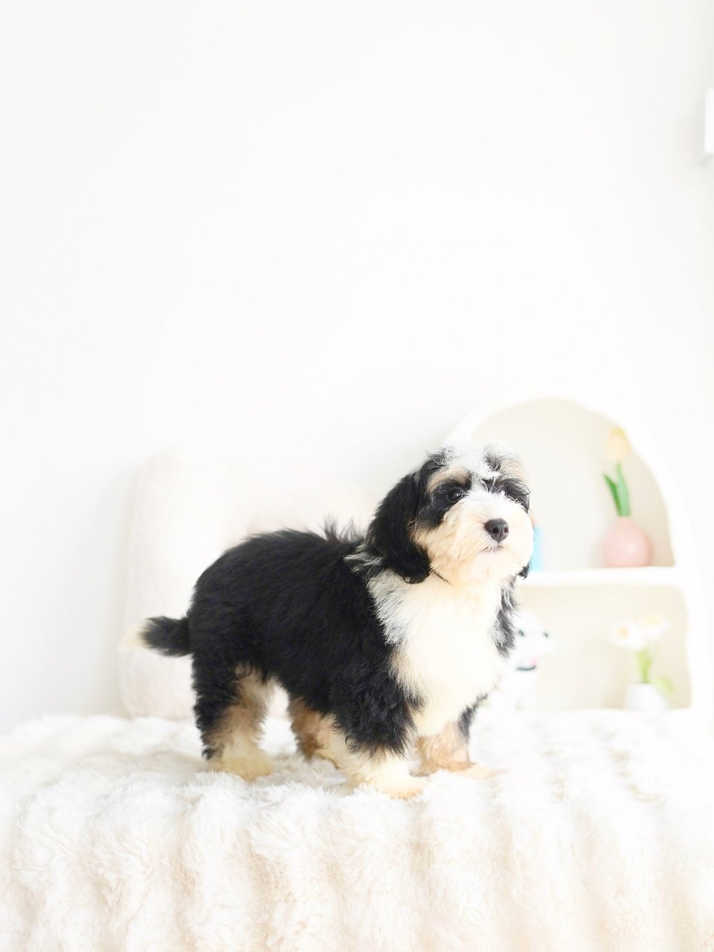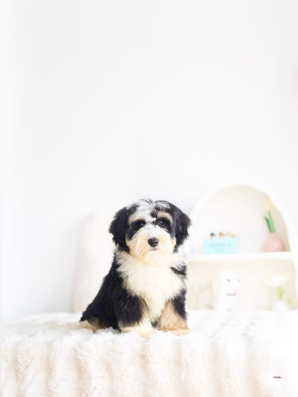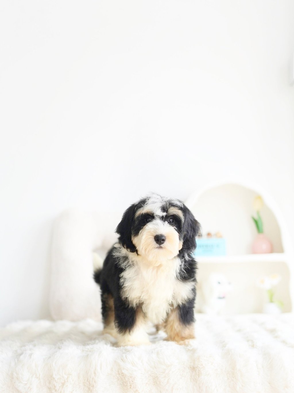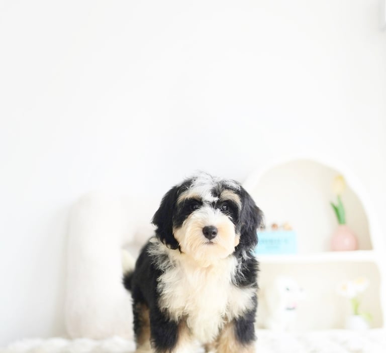 An Aussie Mountain Doodle, also known as an Australian Mountain Doodle or AMD is a combination of three different breeds; the Australian Shepherd, Bernese Mountain Dog, and Poodle.