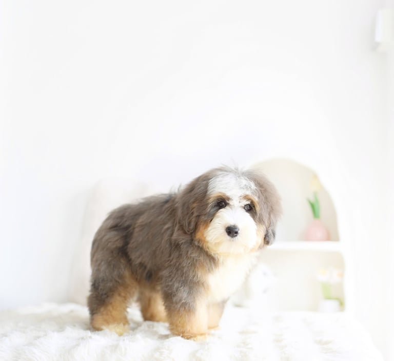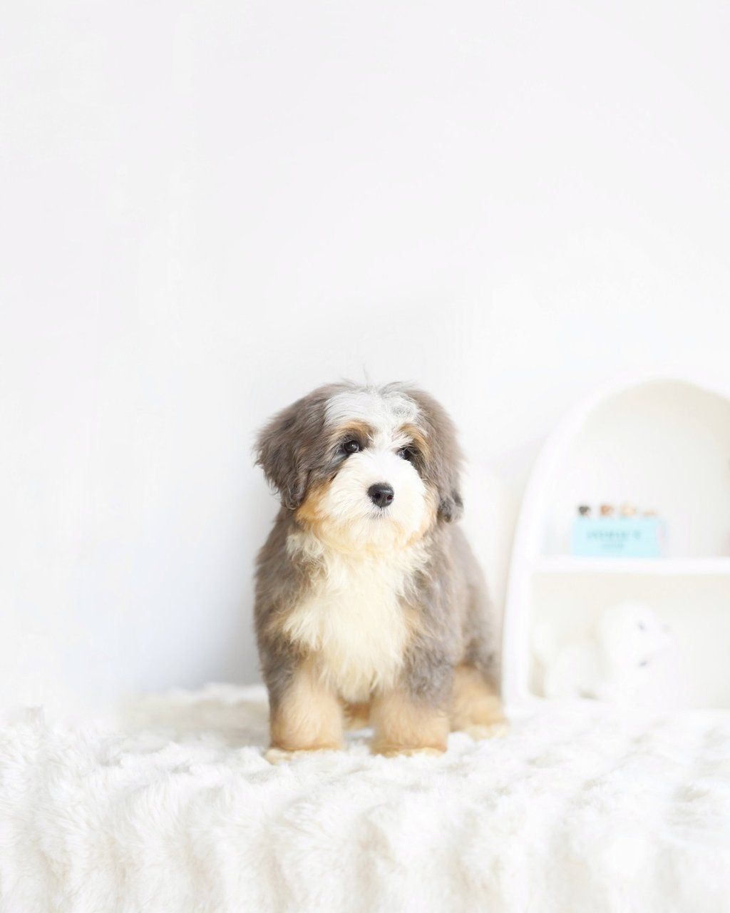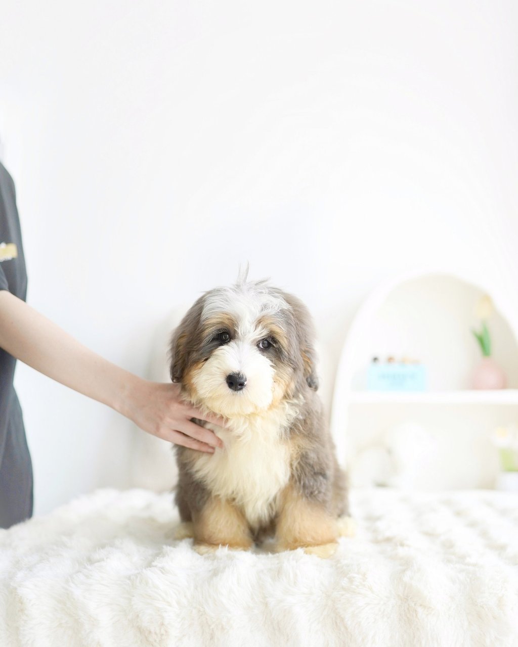An Aussie Mountain Doodle, also known as an Australian Mountain Doodle or AMD is a combination of three different breeds; the Australian Shepherd, Bernese Mountain Dog, and Poodle.