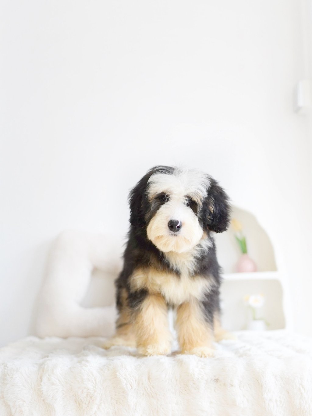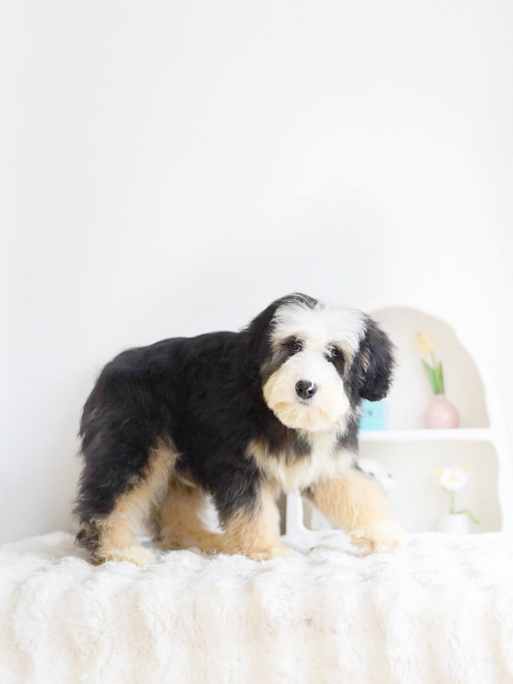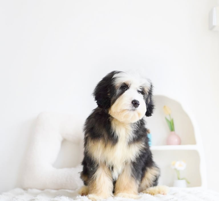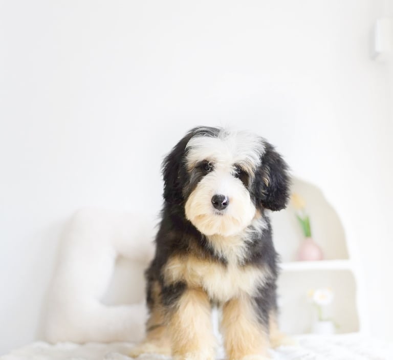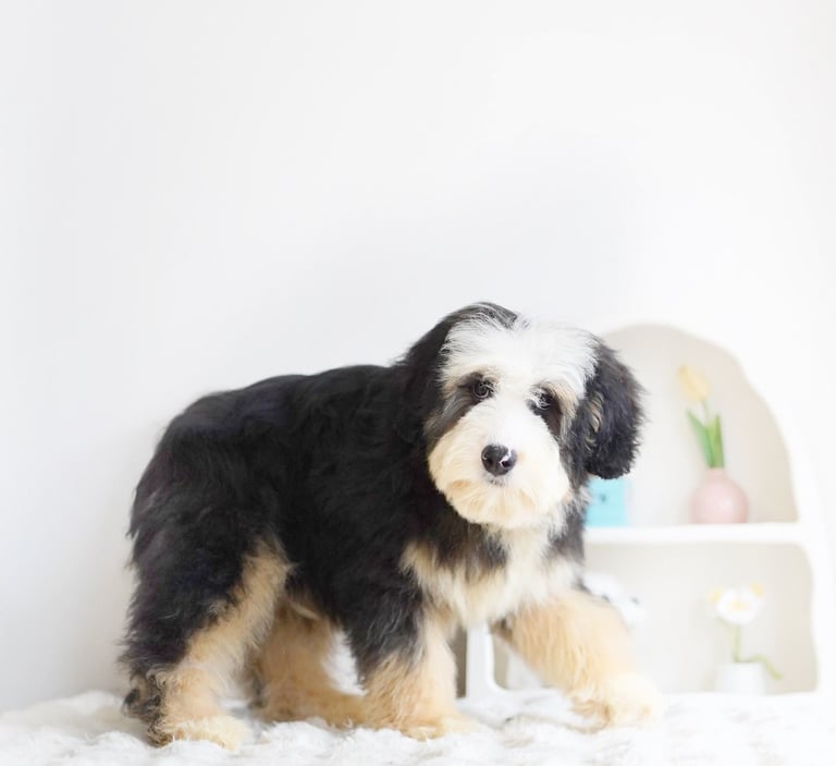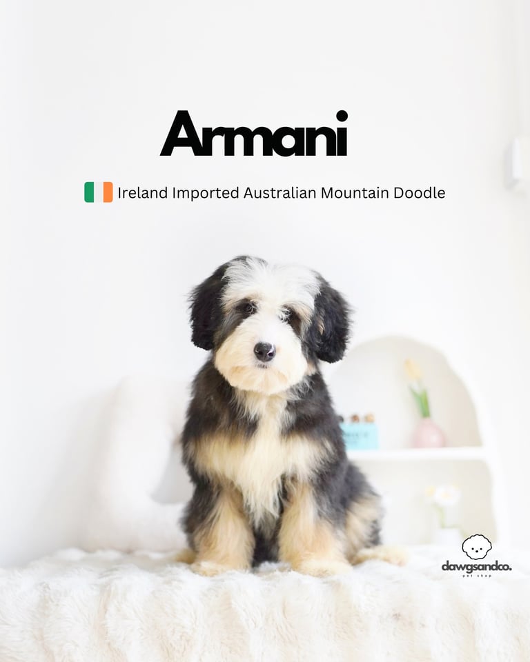 An Aussie Mountain Doodle, also known as an Australian Mountain Doodle or AMD is a combination of three different breeds; the Australian Shepherd, Bernese Mountain Dog, and Poodle.