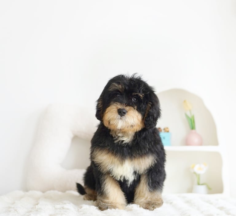 An Aussie Mountain Doodle, also known as an Australian Mountain Doodle or AMD is a combination of three different breeds; the Australian Shepherd, Bernese Mountain Dog, and Poodle.