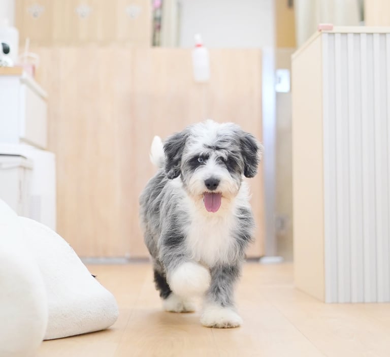 An Aussie Mountain Doodle, also known as an Australian Mountain Doodle or AMD is a combination of three different breeds; the Australian Shepherd, Bernese Mountain Dog, and Poodle.