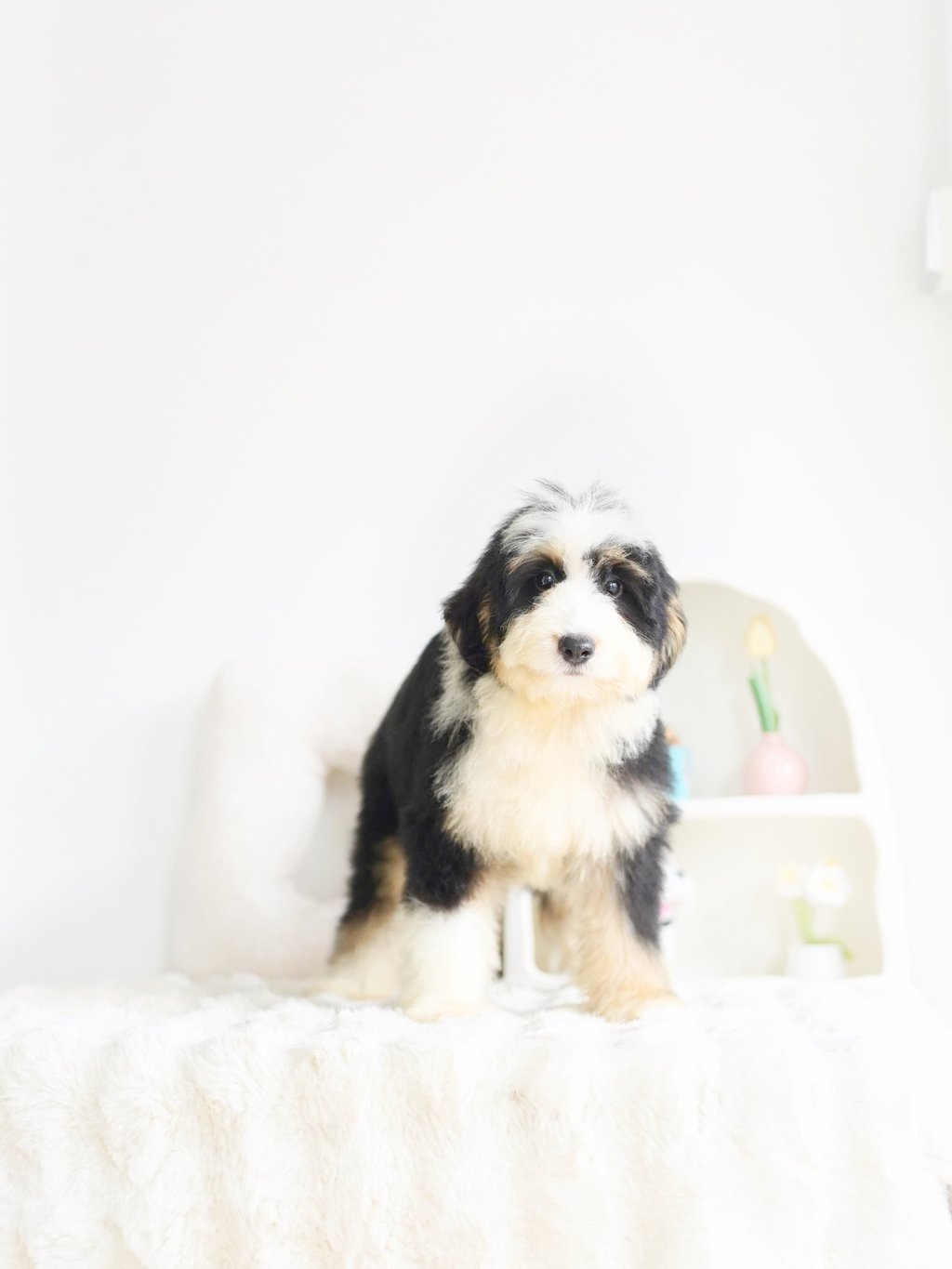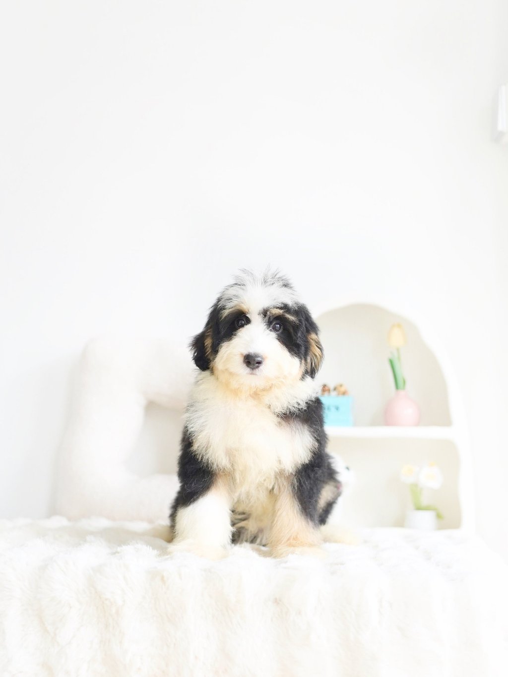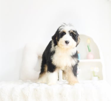 Coat: Bernedoodles often have wavy or curly coats that are low-shedding, making them a good choice for people with allergies. Their coats can come in various colors, including black, white, brown, and a combination of these, often resulting in a tricolor pattern that is characteristic of the Bernese Mountain Dog.