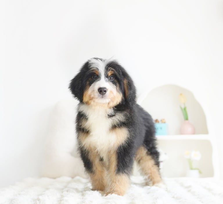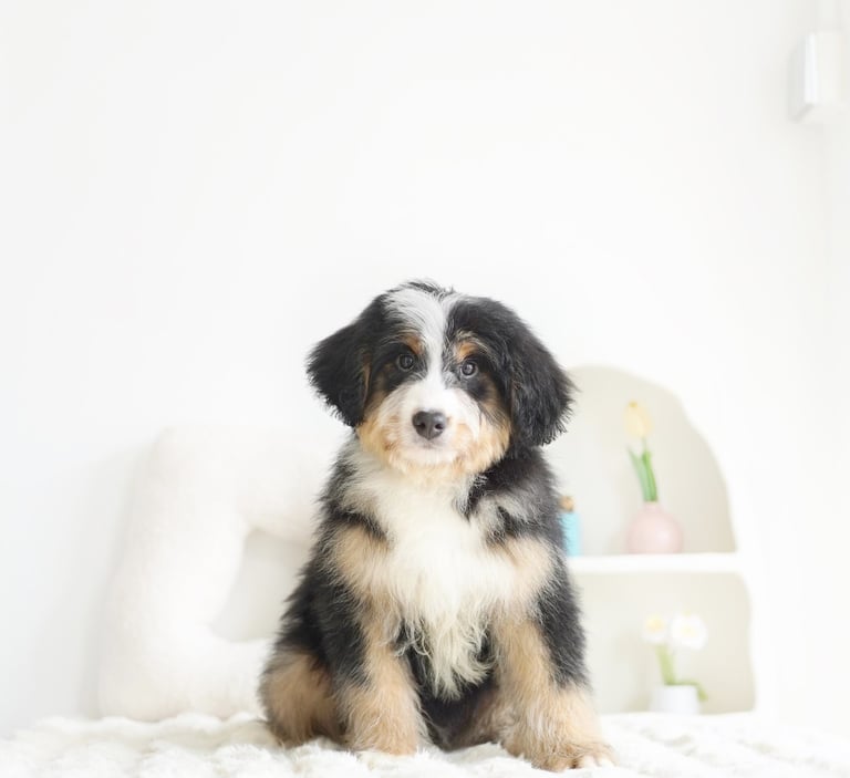 Coat: Bernedoodles often have wavy or curly coats that are low-shedding, making them a good choice for people with allergies. Their coats can come in various colors, including black, white, brown, and a combination of these, often resulting in a tricolor pattern that is characteristic of the Bernese Mountain Dog.