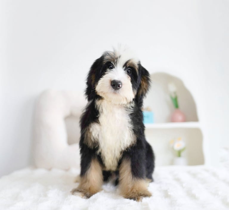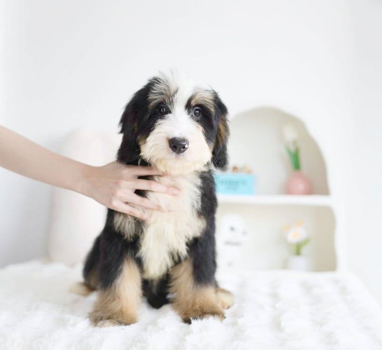 Coat: Bernedoodles often have wavy or curly coats that are low-shedding, making them a good choice for people with allergies. Their coats can come in various colors, including black, white, brown, and a combination of these, often resulting in a tricolor pattern that is characteristic of the Bernese Mountain Dog.