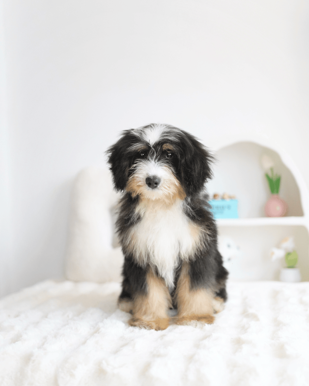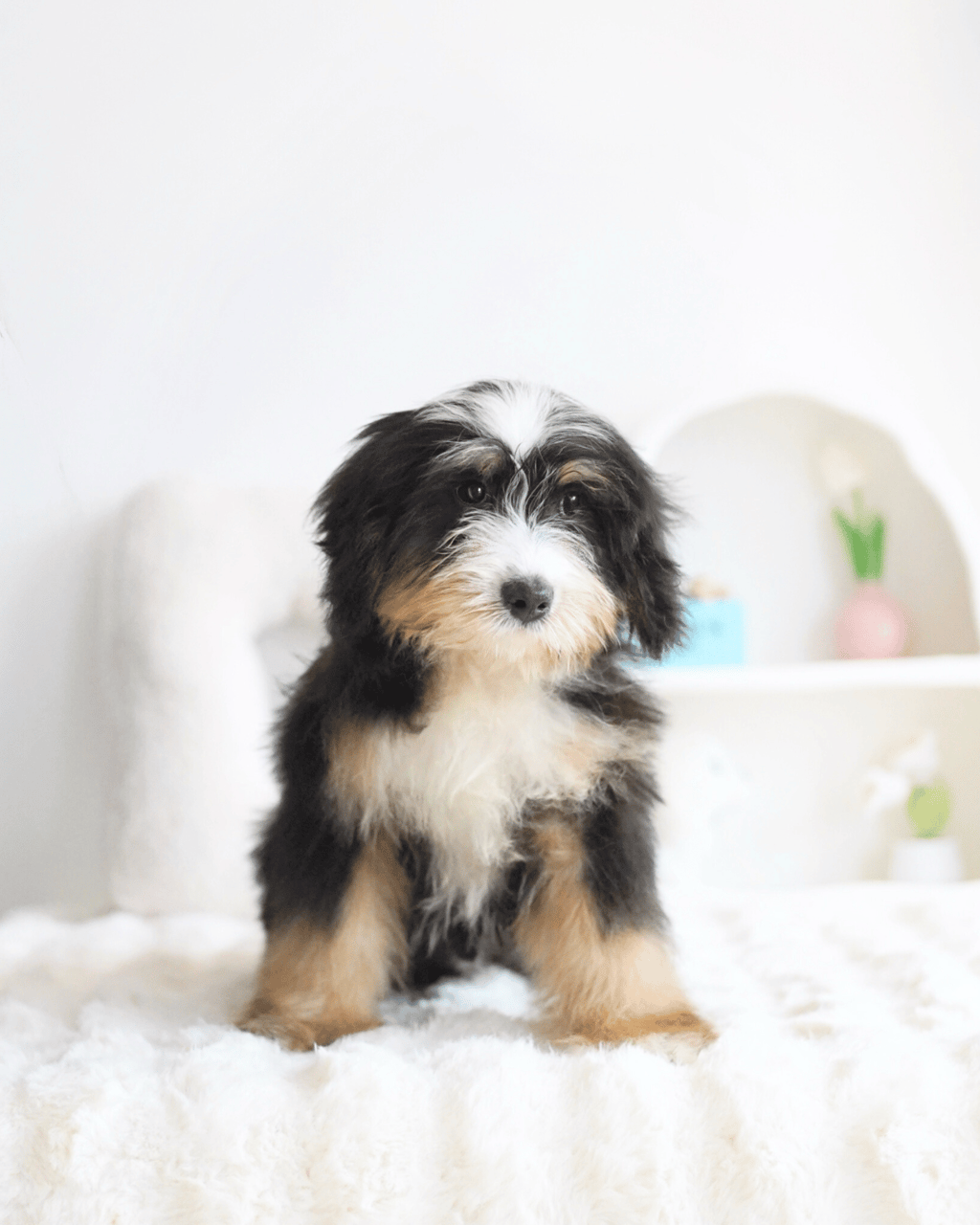 Coat: Bernedoodles often have wavy or curly coats that are low-shedding, making them a good choice for people with allergies. Their coats can come in various colors, including black, white, brown, and a combination of these, often resulting in a tricolor pattern that is characteristic of the Bernese Mountain Dog.