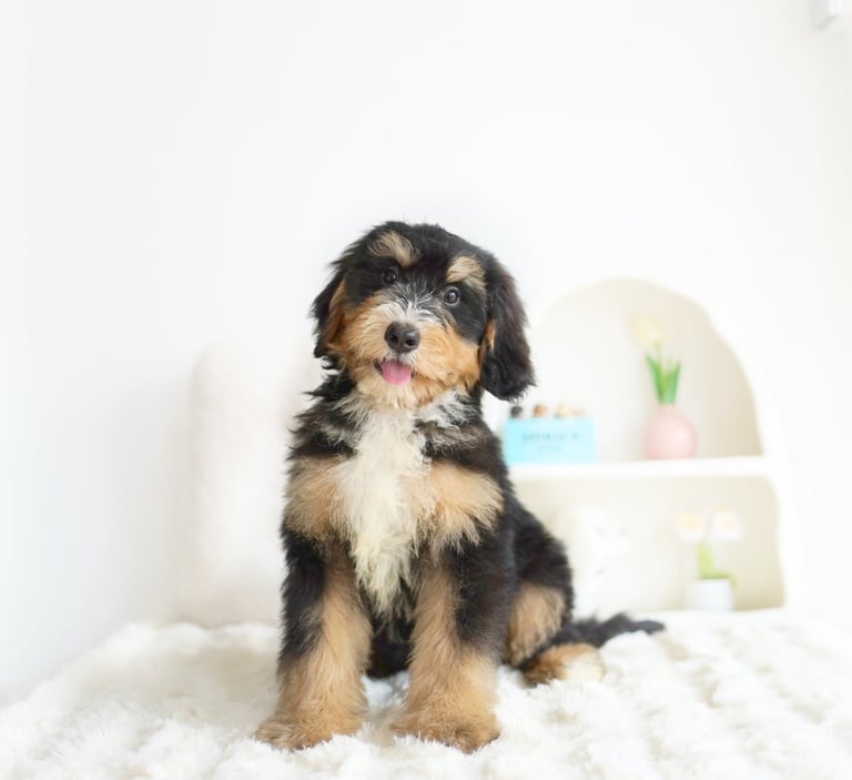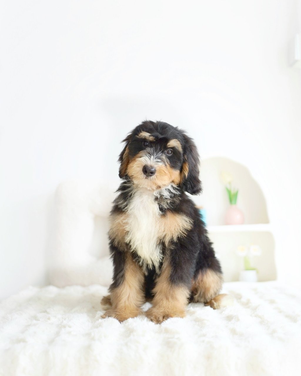 Coat: Bernedoodles often have wavy or curly coats that are low-shedding, making them a good choice for people with allergies. Their coats can come in various colors, including black, white, brown, and a combination of these, often resulting in a tricolor pattern that is characteristic of the Bernese Mountain Dog.