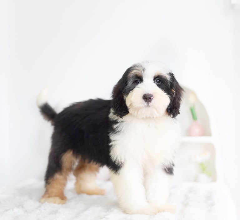 Coat: Bernedoodles often have wavy or curly coats that are low-shedding, making them a good choice for people with allergies. Their coats can come in various colors, including black, white, brown, and a combination of these, often resulting in a tricolor pattern that is characteristic of the Bernese Mountain Dog.