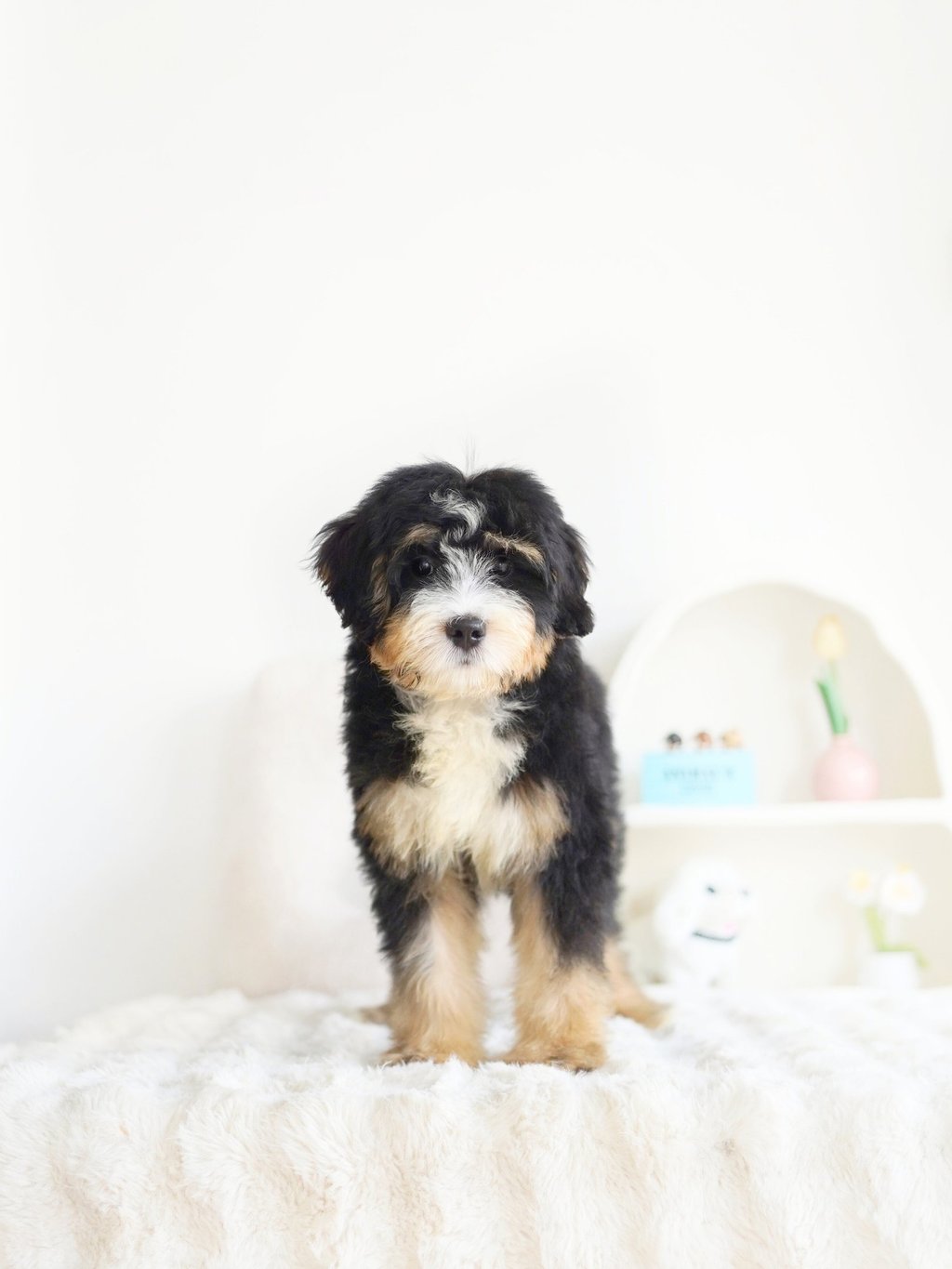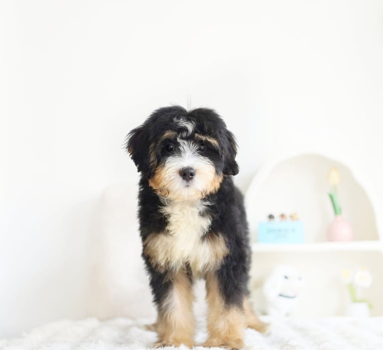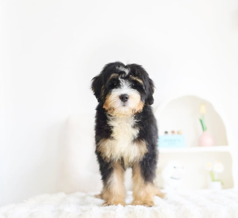 Coat: Bernedoodles often have wavy or curly coats that are low-shedding, making them a good choice for people with allergies. Their coats can come in various colors, including black, white, brown, and a combination of these, often resulting in a tricolor pattern that is characteristic of the Bernese Mountain Dog.