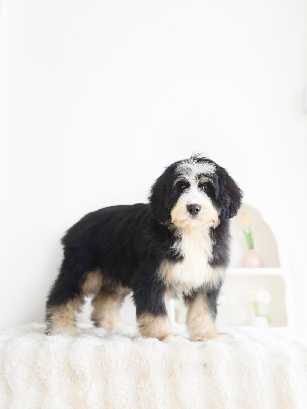 Coat: Bernedoodles often have wavy or curly coats that are low-shedding, making them a good choice for people with allergies. Their coats can come in various colors, including black, white, brown, and a combination of these, often resulting in a tricolor pattern that is characteristic of the Bernese Mountain Dog.