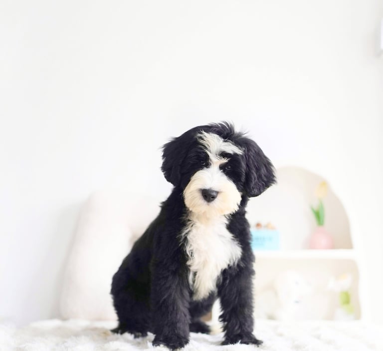 Coat: Bernedoodles often have wavy or curly coats that are low-shedding, making them a good choice for people with allergies. Their coats can come in various colors, including black, white, brown, and a combination of these, often resulting in a tricolor pattern that is characteristic of the Bernese Mountain Dog.