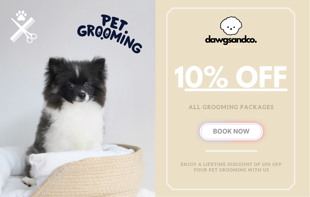 Your first grooming is FREE with us. In addition to the lifetime 10% discount voucher, pamper your new pup with us.