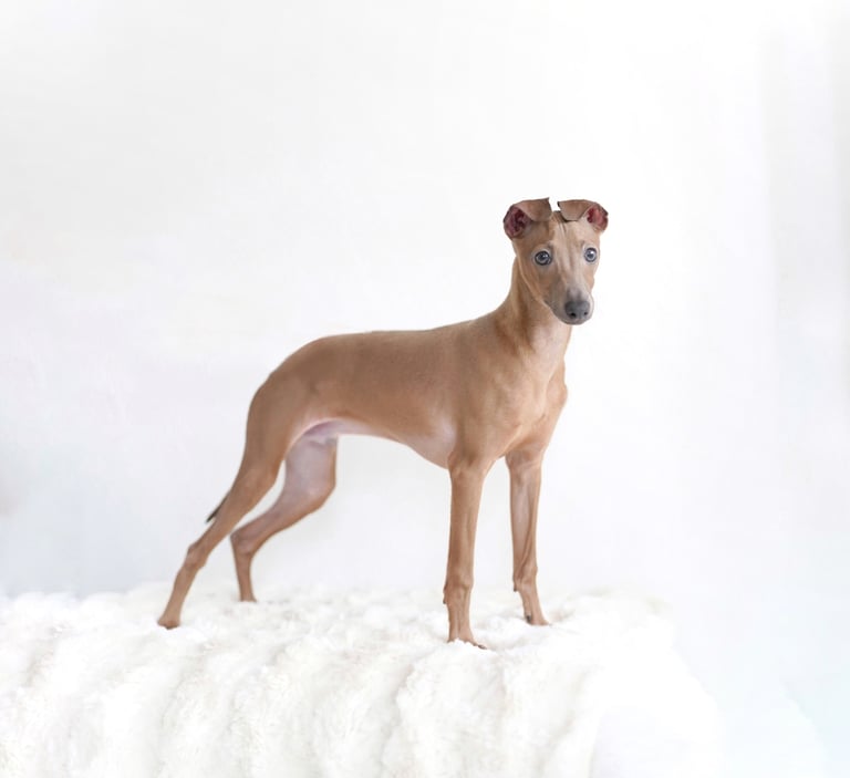 Face: The Italian Greyhound has a small, elegant head with a long, pointed muzzle. Their eyes are dark and expressive, and their ears are small, folded back, and often described as "rose-shaped" when they stand alert.
