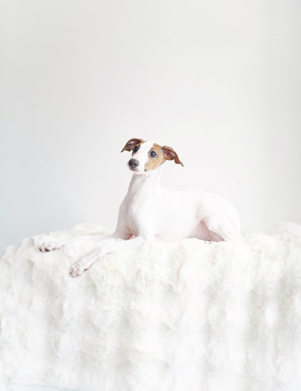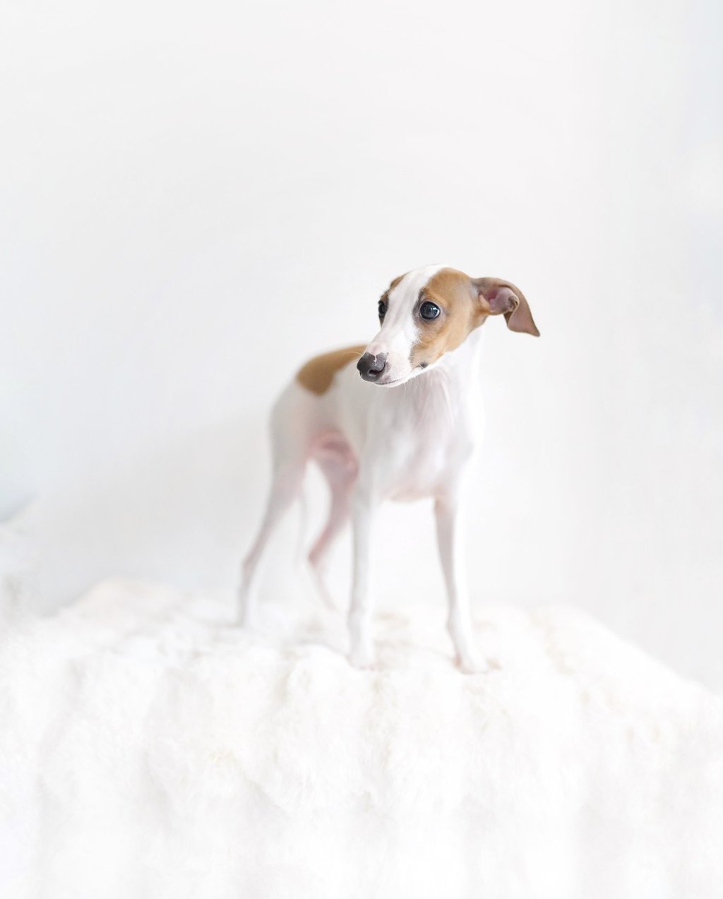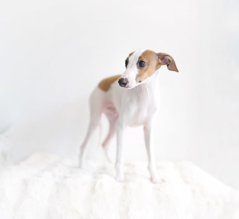 Face: The Italian Greyhound has a small, elegant head with a long, pointed muzzle. Their eyes are dark and expressive, and their ears are small, folded back, and often described as "rose-shaped" when they stand alert.