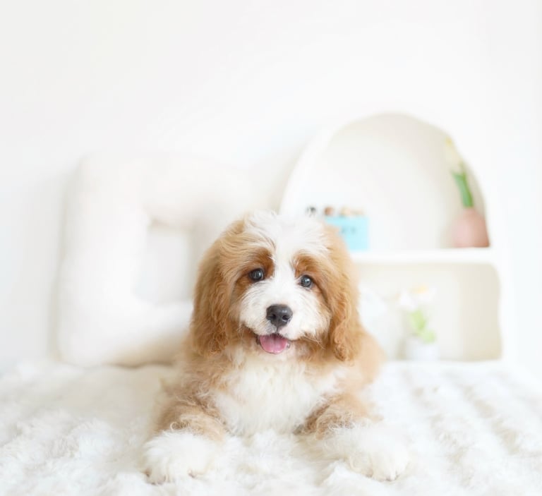 King Bernedoodles are a mixed breed created by crossing a Cavalier King Charles with Bernedoodle. They are smaller in size compared to a Bernedoodle while maintaining their calm temperament and hypoallerginc traits.