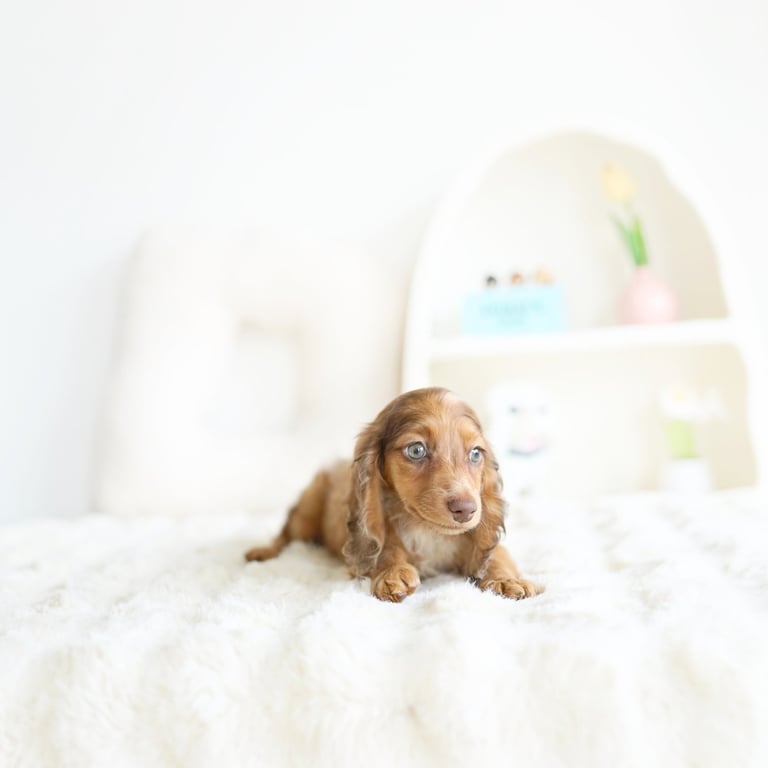 That's how we ended up bringing one home with us - Blue, our shaded cream mini dachshund, of course!"