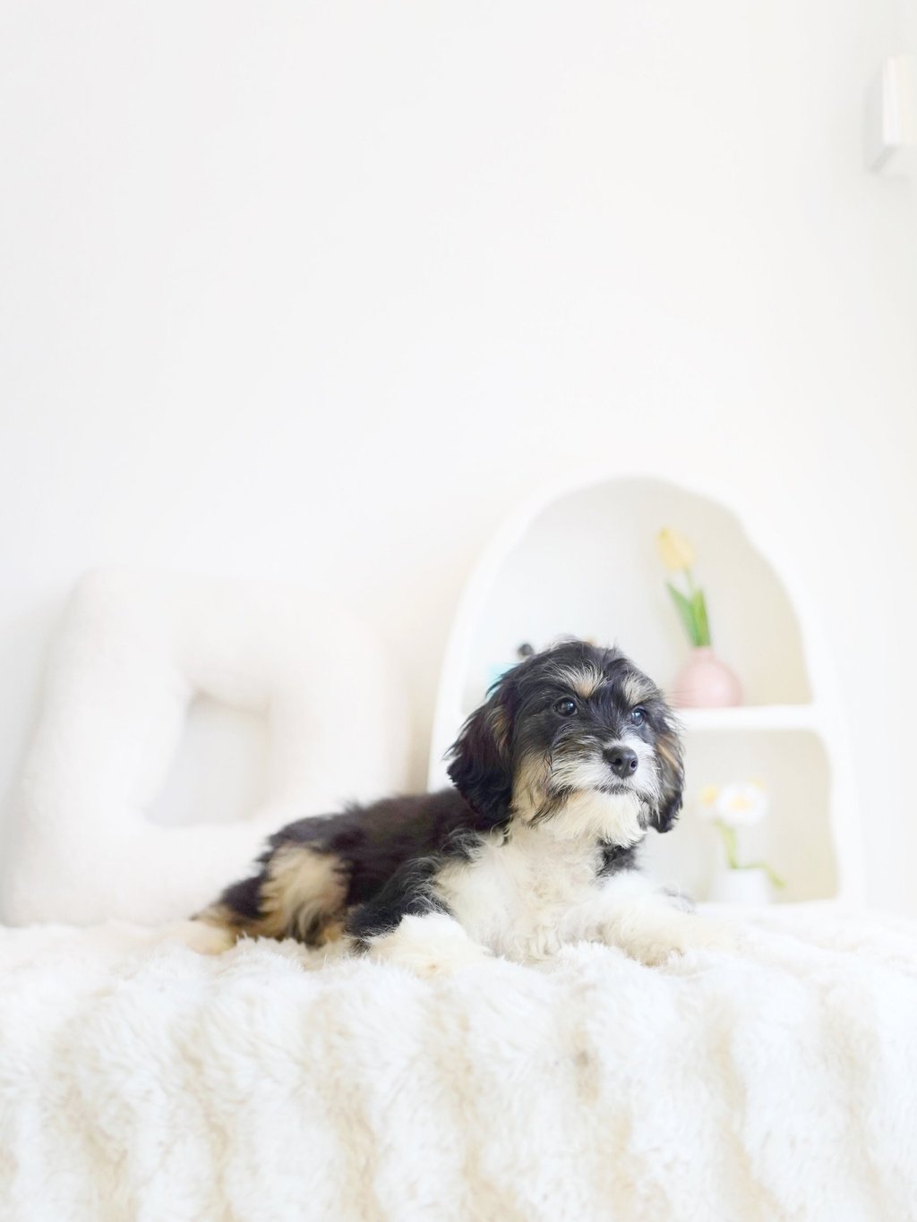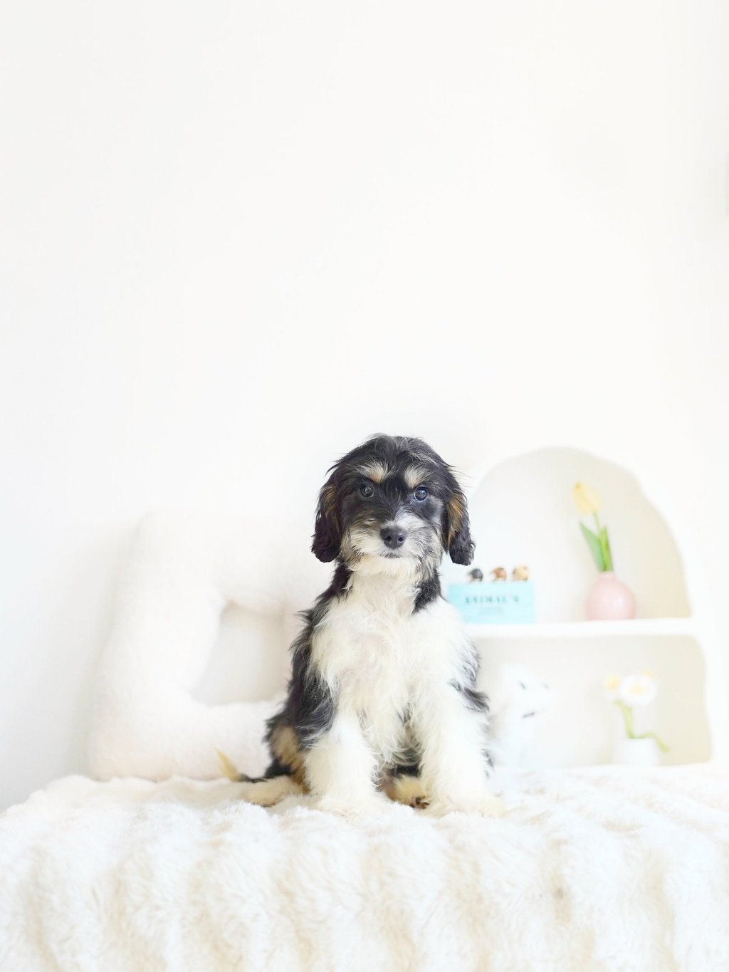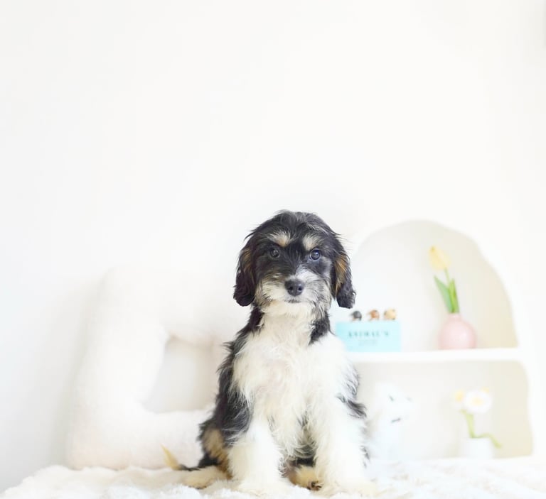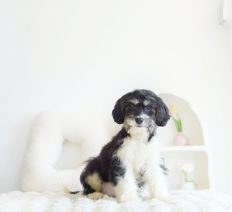 Munchkin Bernedoodles are a mixed breed created by crossing a Cavalier King Charles with Bernedoodle. They are smaller in size compared to a Bernedoodle while maintaining their calm temperament and hypoallerginc traits.