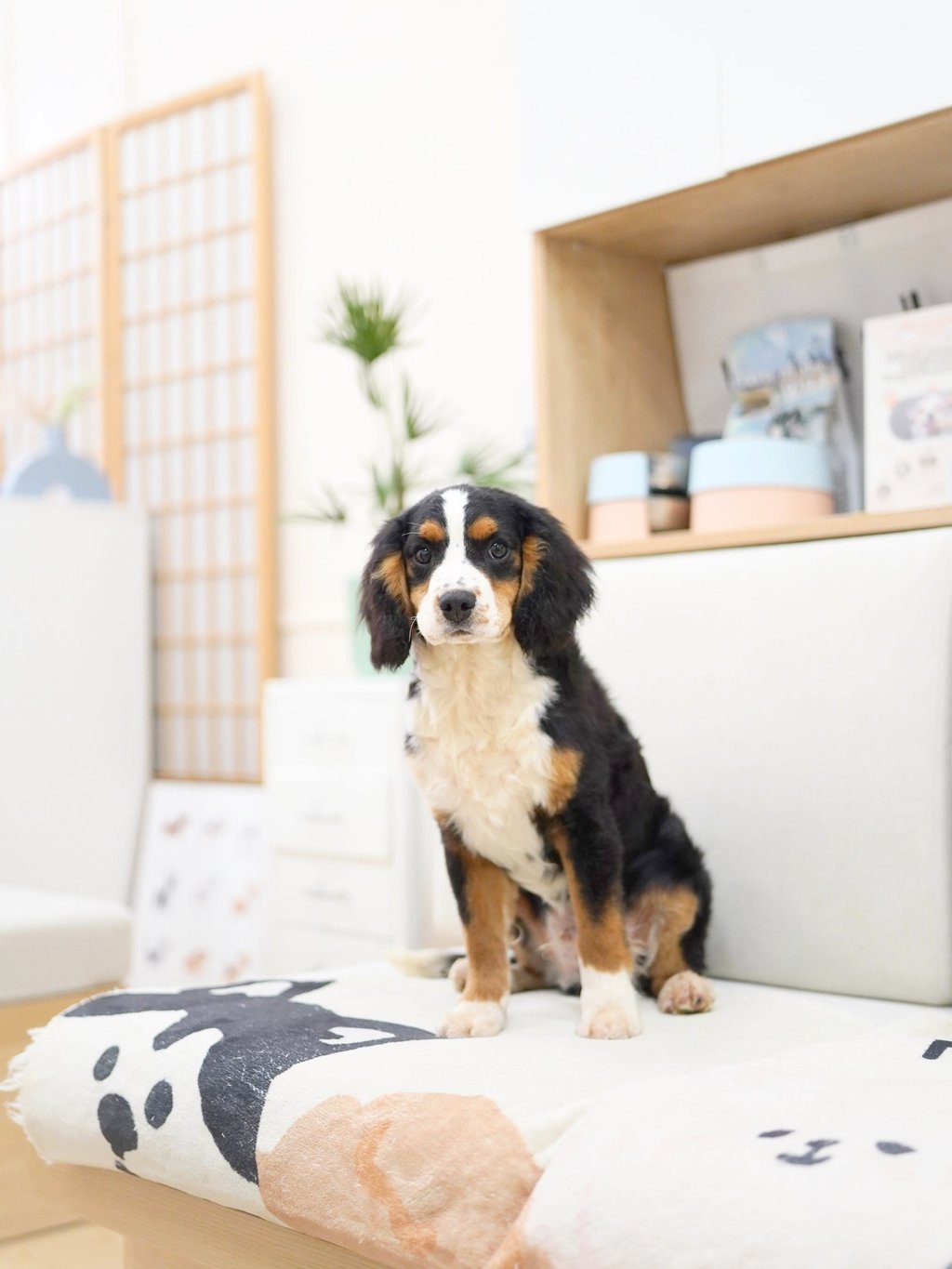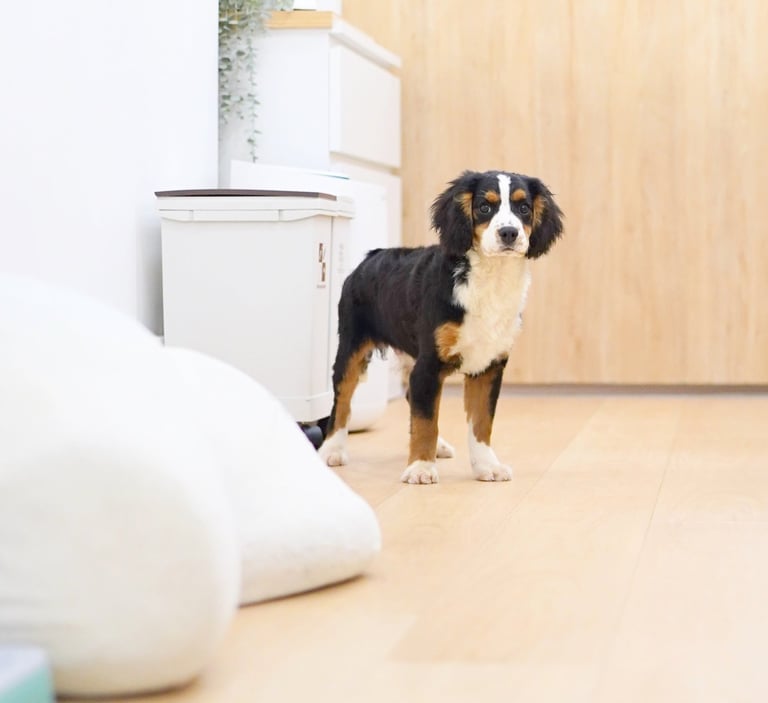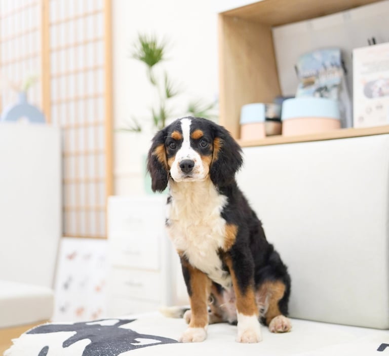 Munchkin Bernedoodles are a mixed breed created by crossing a Cavalier King Charles with Bernedoodle. They are smaller in size compared to a Bernedoodle while maintaining their calm temperament and hypoallerginc traits.