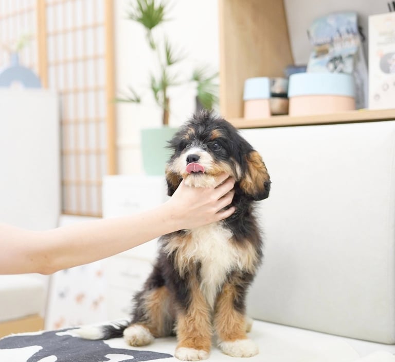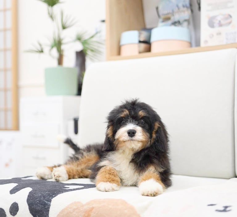 Munchkin Bernedoodles are a mixed breed created by crossing a Cavalier King Charles with Bernedoodle. They are smaller in size compared to a Bernedoodle while maintaining their calm temperament and hypoallerginc traits.