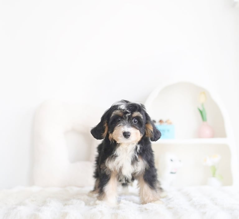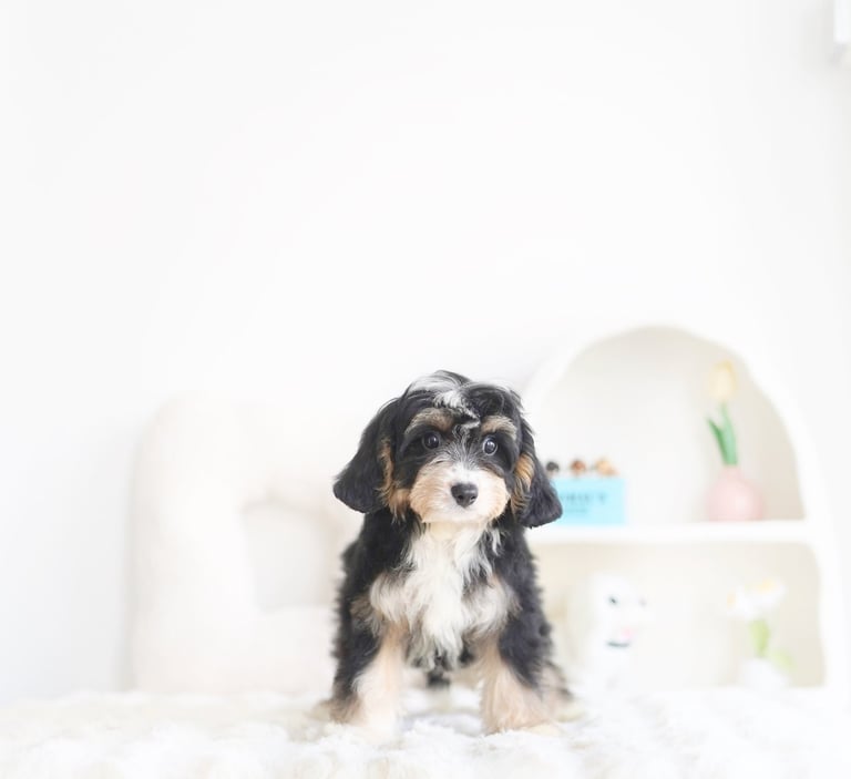 Munchkin Bernedoodles are a mixed breed created by crossing a Cavalier King Charles with Bernedoodle. They are smaller in size compared to a Bernedoodle while maintaining their calm temperament and hypoallerginc traits.