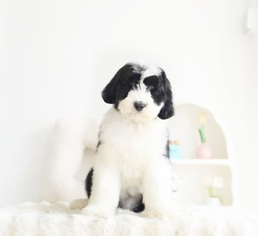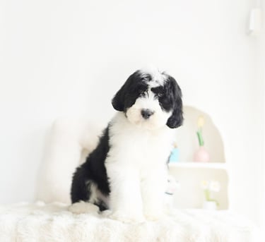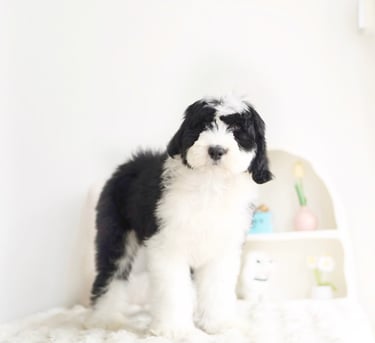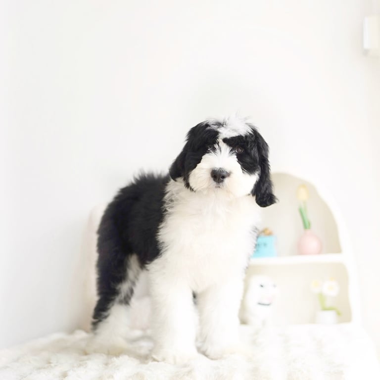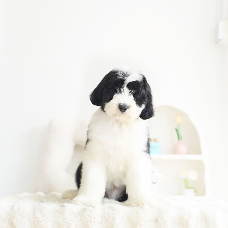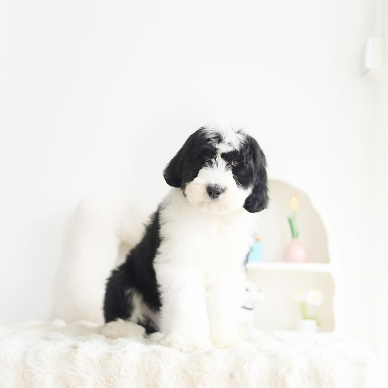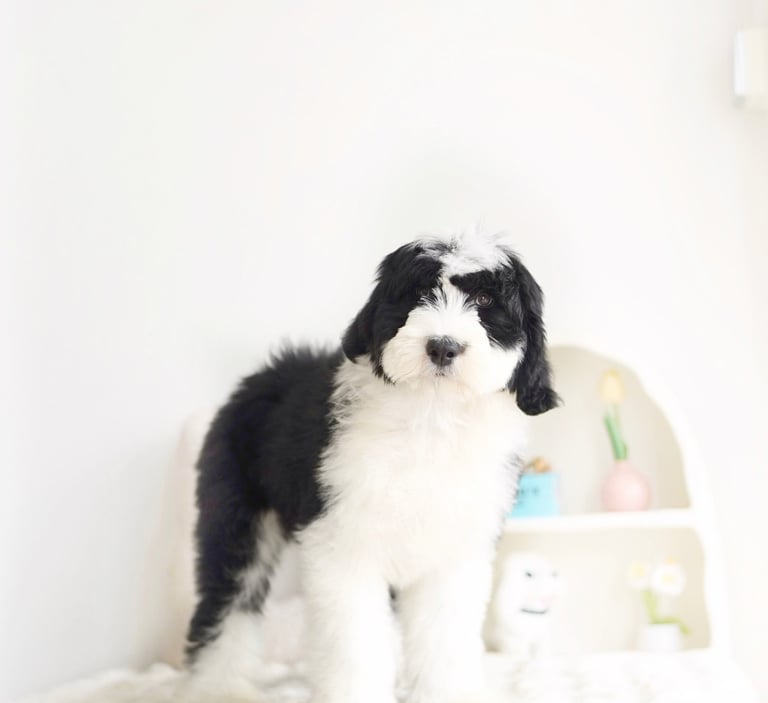 Before bringing your Sheepadoodle home, prepare your living space:Puppy-Proof Your Home: Secure loose wires, keep small objects out of reach, and block off unsafe areas.Stock Up on Essentials: Food and water bowls, puppy food, a comfy bed, toys, grooming supplies, and training pads.Plan for Training & Socialization: Start early with positive reinforcement and introduce your puppy to different people, sounds, and environments.
