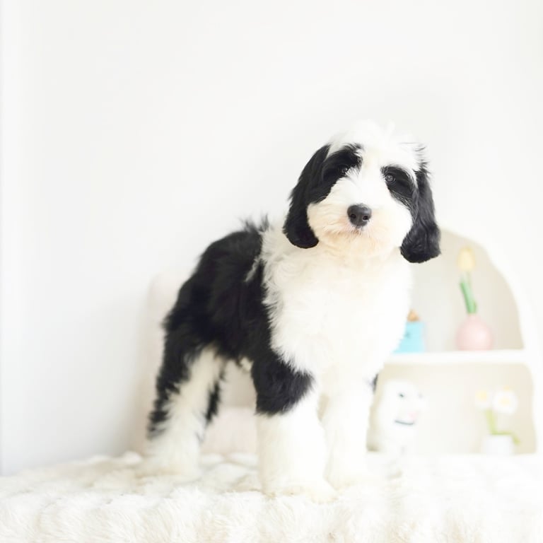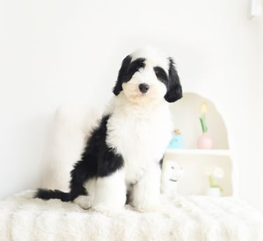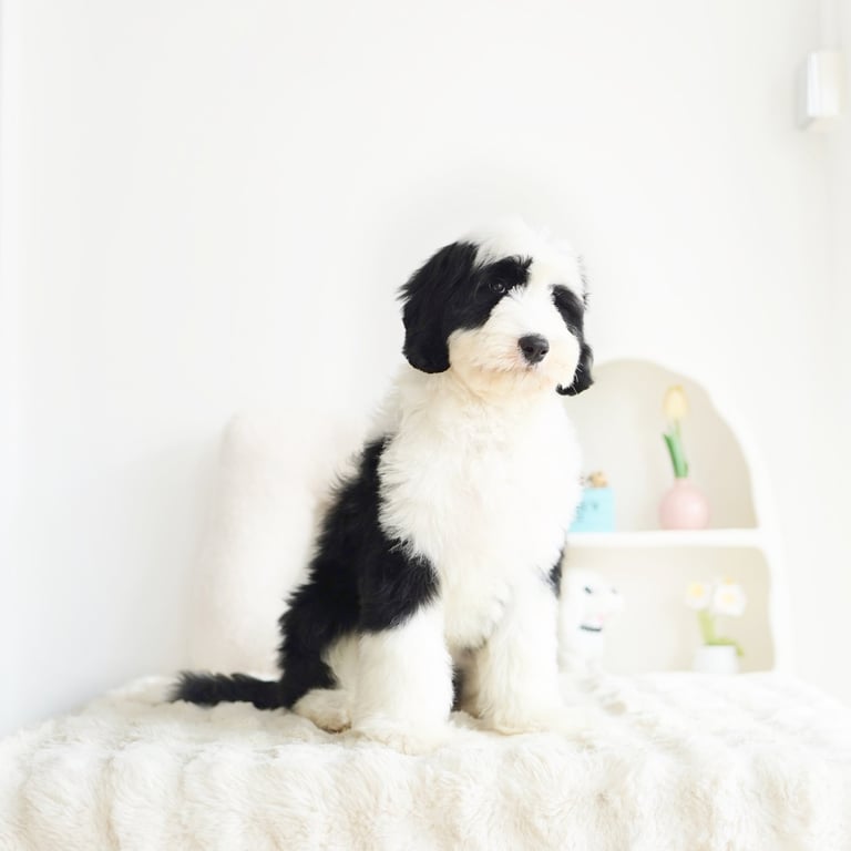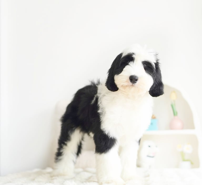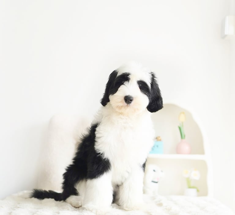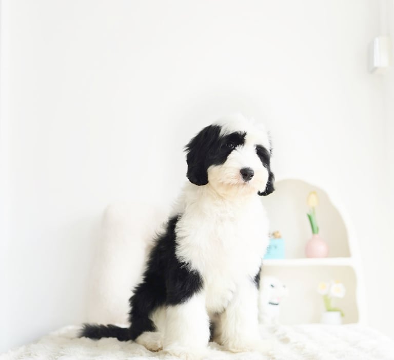 Before bringing your Sheepadoodle home, prepare your living space:Puppy-Proof Your Home: Secure loose wires, keep small objects out of reach, and block off unsafe areas.Stock Up on Essentials: Food and water bowls, puppy food, a comfy bed, toys, grooming supplies, and training pads.Plan for Training & Socialization: Start early with positive reinforcement and introduce your puppy to different people, sounds, and environments.