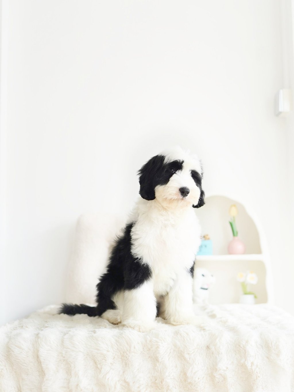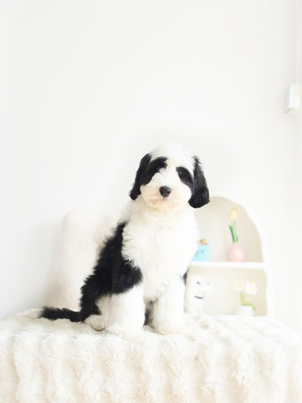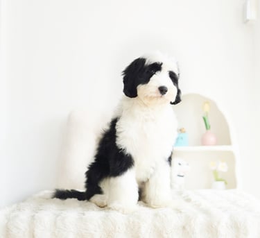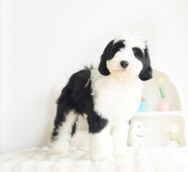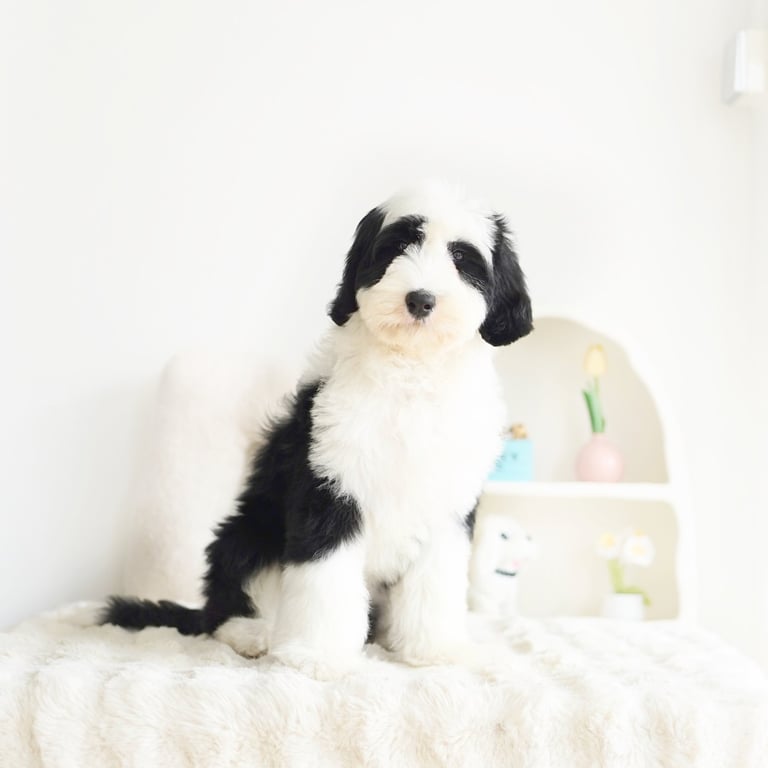Before bringing your Sheepadoodle home, prepare your living space:Puppy-Proof Your Home: Secure loose wires, keep small objects out of reach, and block off unsafe areas.Stock Up on Essentials: Food and water bowls, puppy food, a comfy bed, toys, grooming supplies, and training pads.Plan for Training & Socialization: Start early with positive reinforcement and introduce your puppy to different people, sounds, and environments.