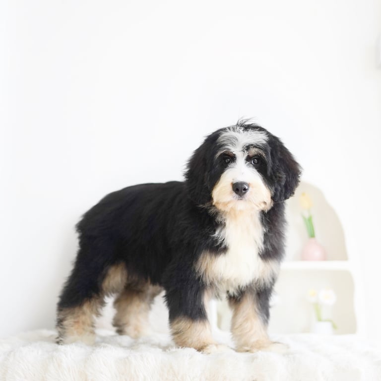 Coat: Bernedoodles often have wavy or curly coats that are low-shedding, making them a good choice for people with allergies. Their coats can come in various colors, including black, white, brown, and a combination of these, often resulting in a tricolor pattern that is characteristic of the Bernese Mountain Dog.