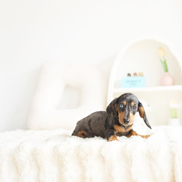 A Miniature Dachshund, often simply referred to as a "Mini Dachshund," is a smaller version of the Dachshund, a breed of dog known for its distinctive appearance and playful personality. Dachshunds are characterized by their elongated bodies, short legs, and long ears. The term "miniature" specifically refers to their smaller size compared to standard Dachshunds.